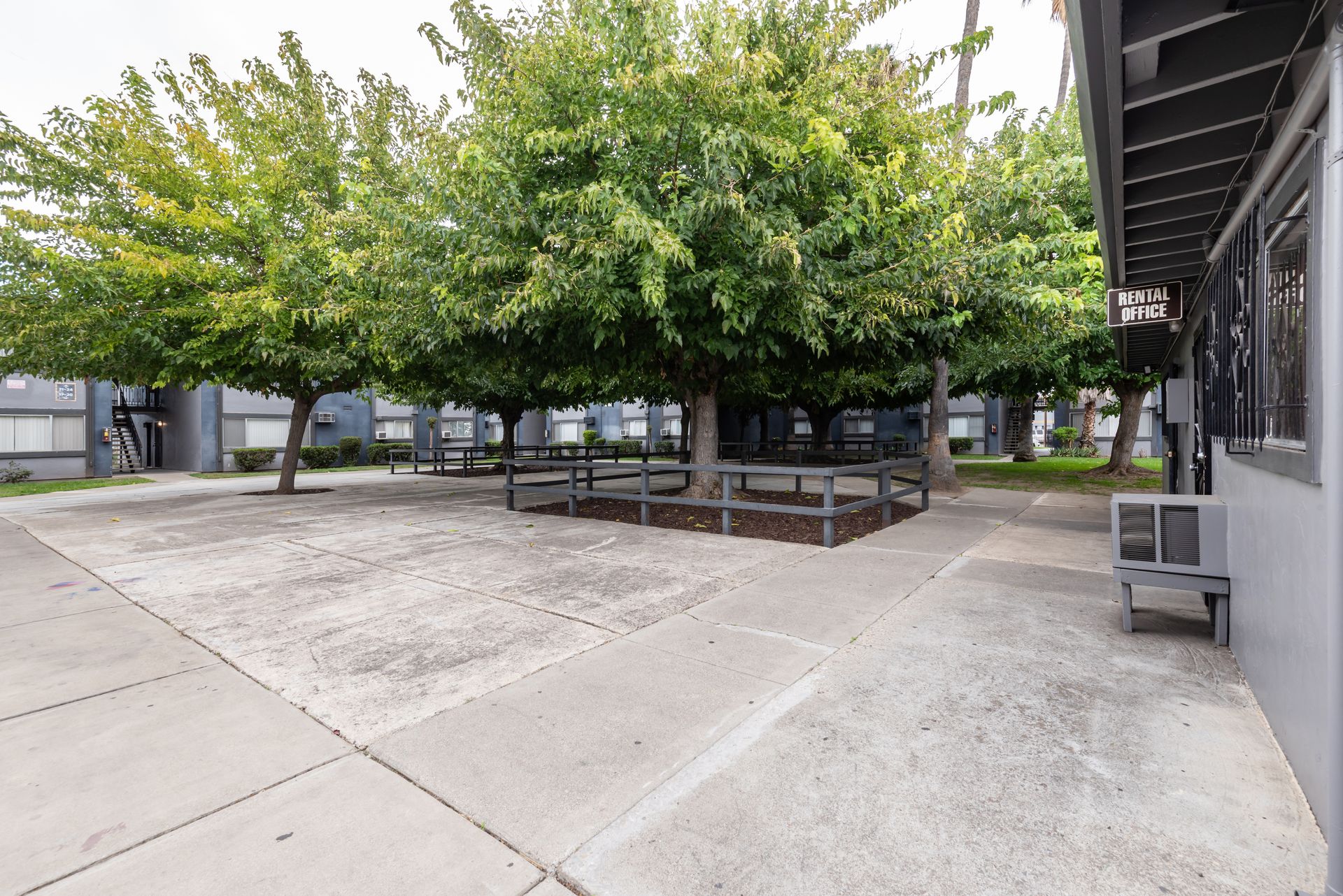 -Courtyards, gardens, and a playground surrounded by mature trees and welcoming shade