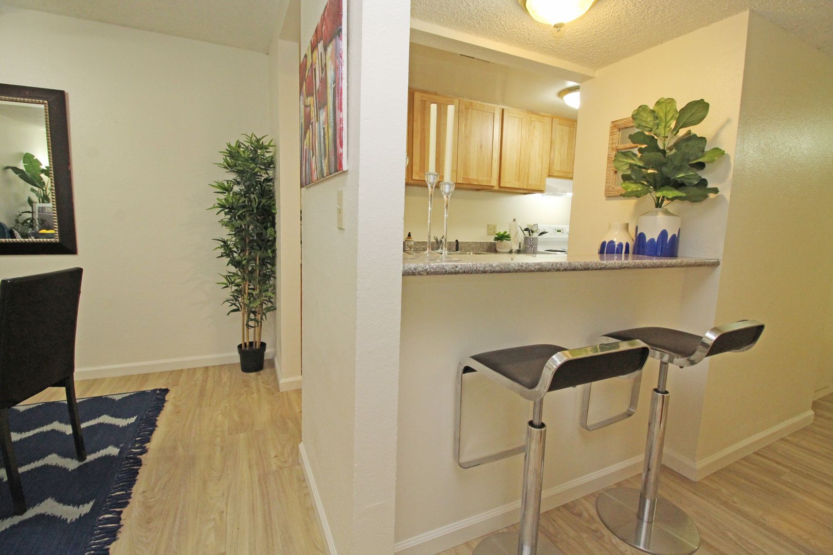 -New granite countertops, wooden cabinets, and a breakfast bar