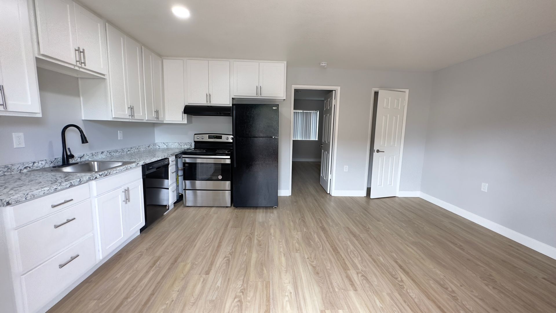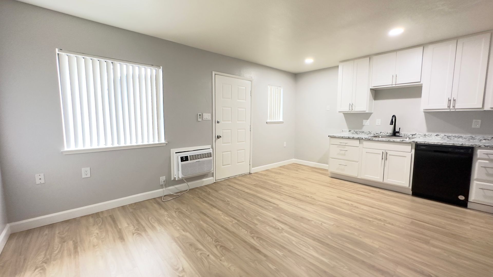 Renovated 1 Bedroom with an open-concept kitchen/living room & washer/dryer hookups! Enjoy updated floors, kitchen cabinets and countertops, large appliances (refrigerator, dishwasher, full-size oven), and all new paint and blinds. A closet in the living room provides added storage. Your bedroom is in the back of the apartment for added privacy, featuring a walk-in closet, full bath with tub/shower and hookups for your private washer and dryer. Relax and dine outside in your own private patio with modern wood-plank walls.